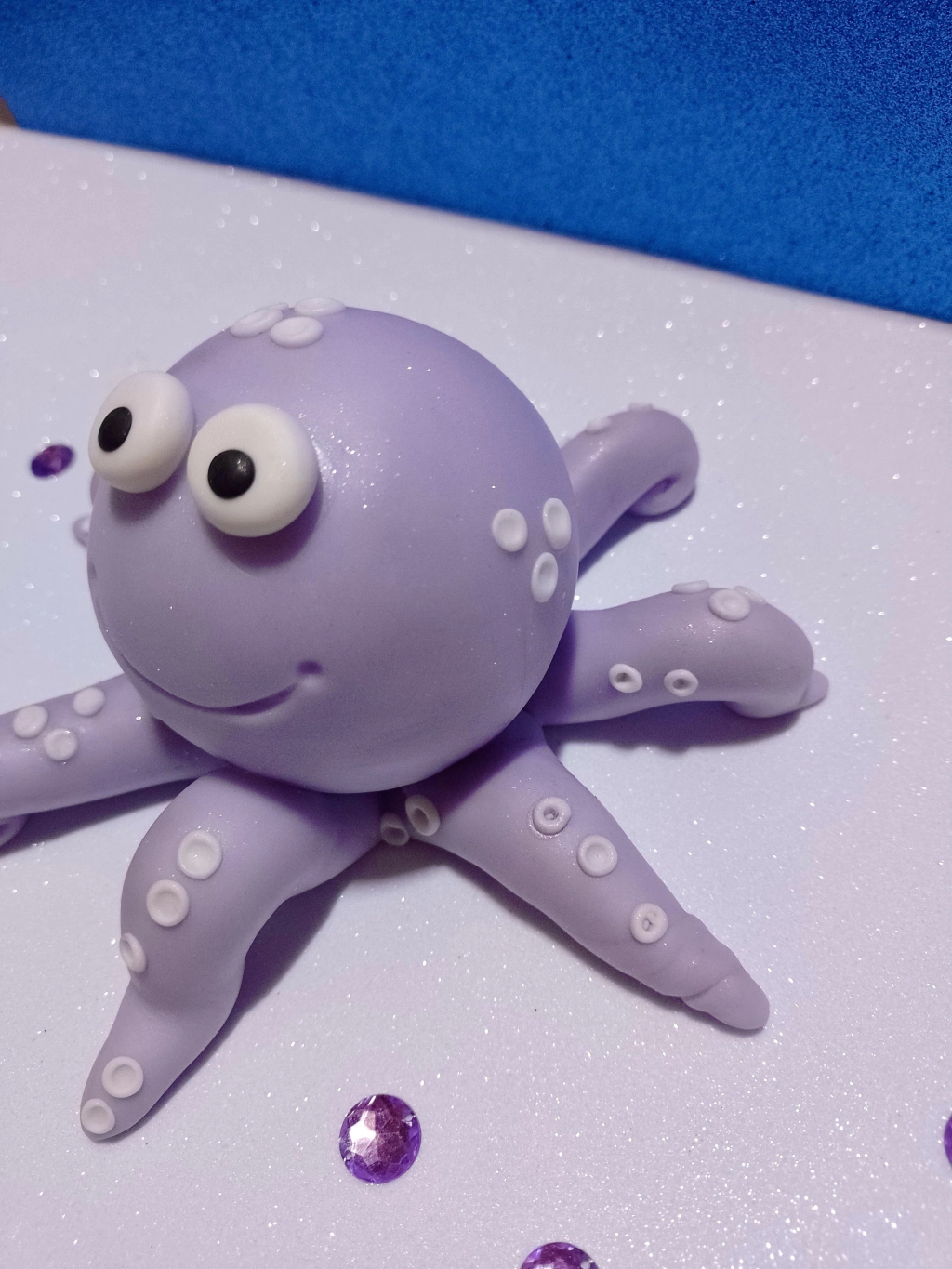 Cada pulpo es hecho a mano, lo que significa que puede haber pequeñas variaciones en los tonos de los colores, aportando un carácter único a cada pieza. Al finalizar, se pincela con un polvo volátil comestible que le da un toque brillante. Si prefieres un acabado mate, indícalo en las notas de tu pedido.