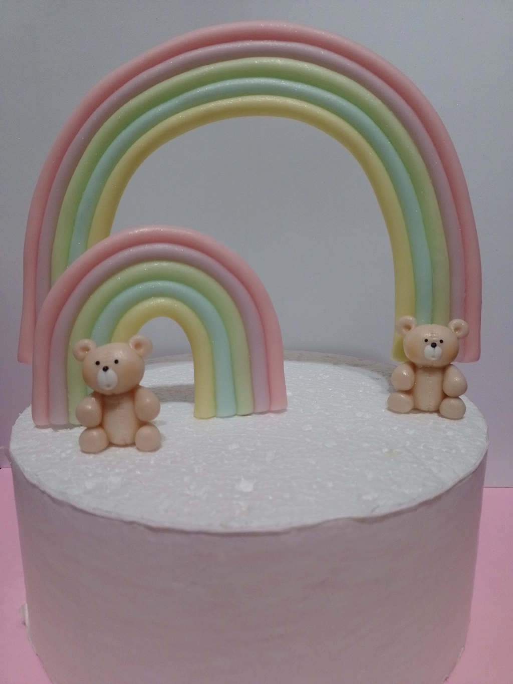 Versatilidad en la Decoración Ambos arcoiris cuentan con pinches para que los coloques donde desees. Además, puedes usar el arcoiris más grande como un hermoso puente entre dos tortas.