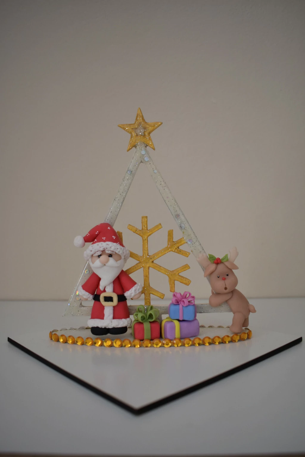 ¡Descubre nuestro Centro Papa Noel y regalos! Este encantador centro de mesa, diseñado con una base de 15x15cm y una altura de 16cm, es el complemento perfecto para tus decoraciones navideñas.