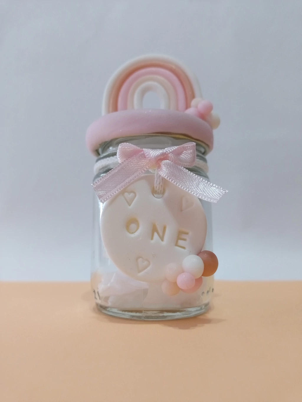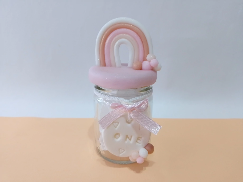 Cada frasco de vidrio de 100cc viene con su tapa forrada en porcelana fría, coronada con un aplique de arcoíris hecho a mano, lleno de color y magia.