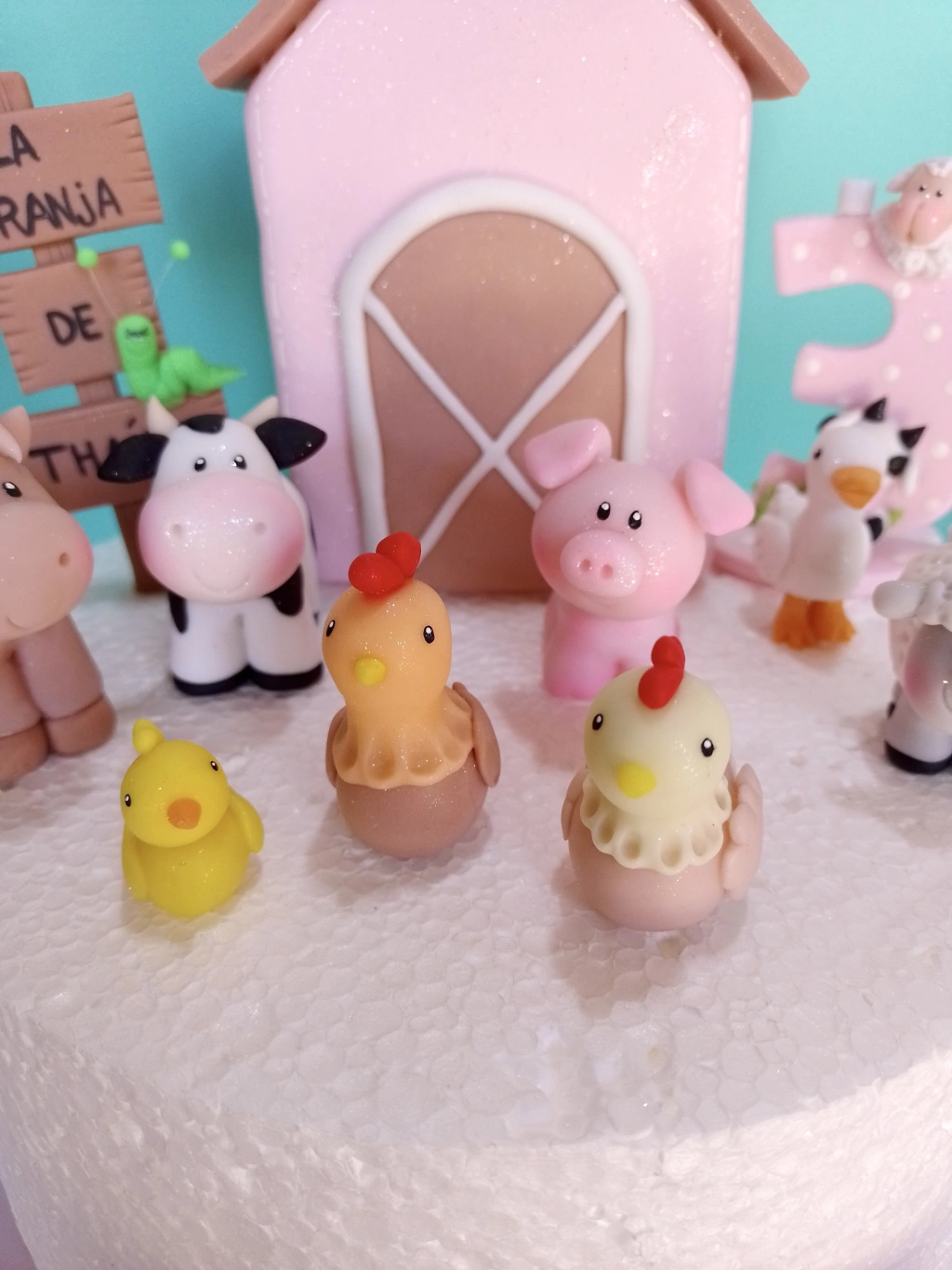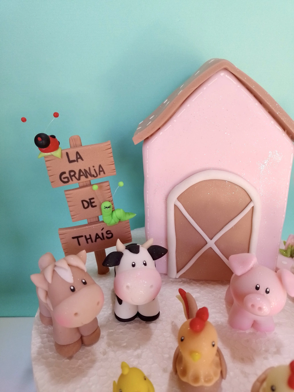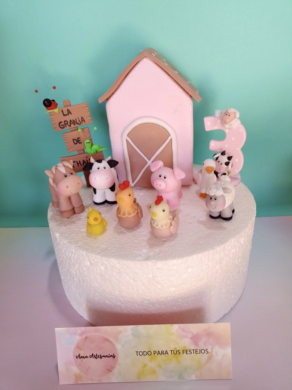 Este encantador conjunto incluye: - Granero de 16 cm de alto, disponible en rosa o celeste. - Un número con vela de 8 cm de alto y 6 cm de diámetro. - Un cartel con pinche de aproximadamente 10 cm de alto. - 8 adorables animalitos: caballo, vaca, chancho, oveja, gallo, gallina, pollito y pato.
